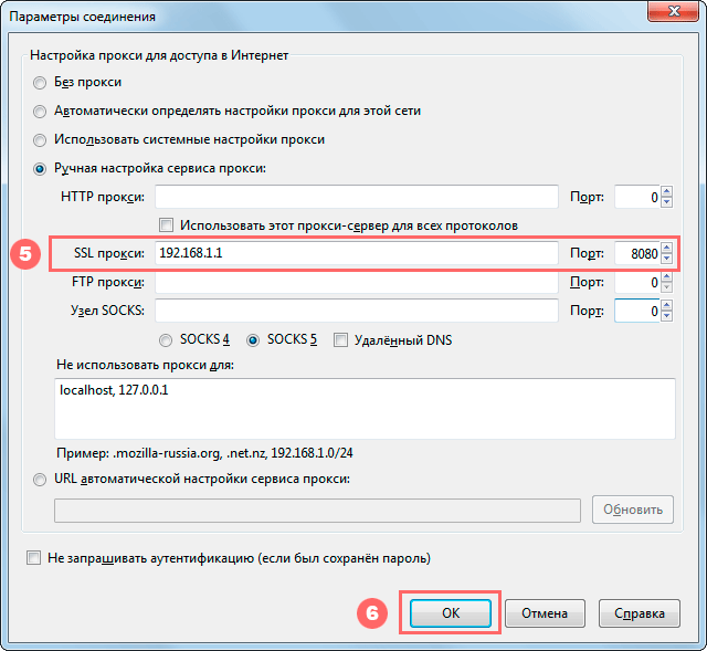 Дальше выберите строчку, соответствующую типу прокси, который вы хотите использовать: HTTP, SSL прокси (он же HTTPS) либо SOCKS. Введите IP-адрес и порт прокси.
